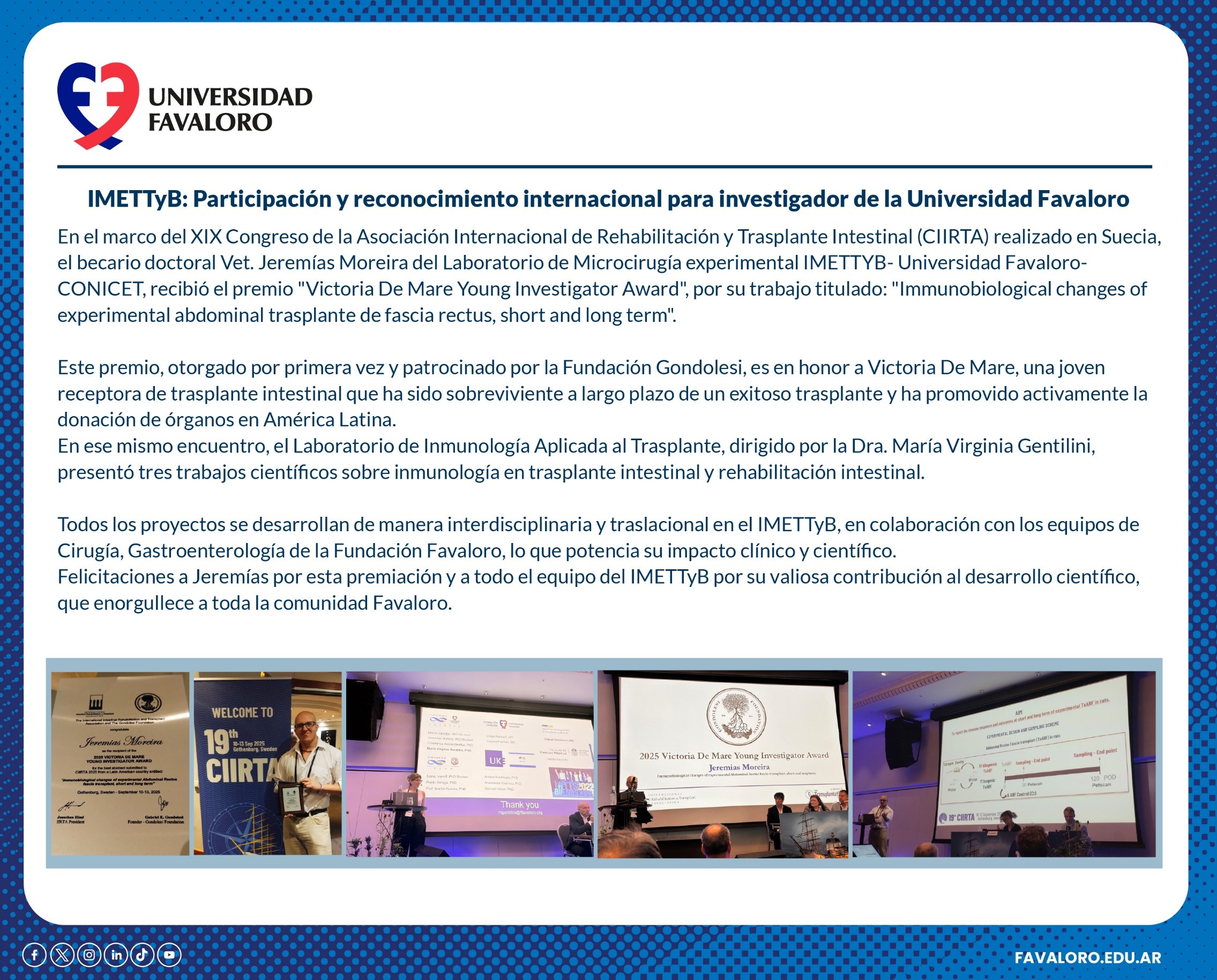 Premio Victoria De Mare al investigador Joven Jeremías Moreira por su trabajo "Immunobiological changes of experimental Abdominal Rectus fascia transplant, short and long term"